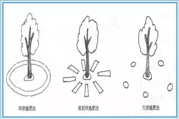 ①环状施肥法:在树冠投影外缘稍远处,挖一环状沟,宽30-50厘米,深20-40厘米,肥料与土壤混合施入,此法多在幼树期采用。
